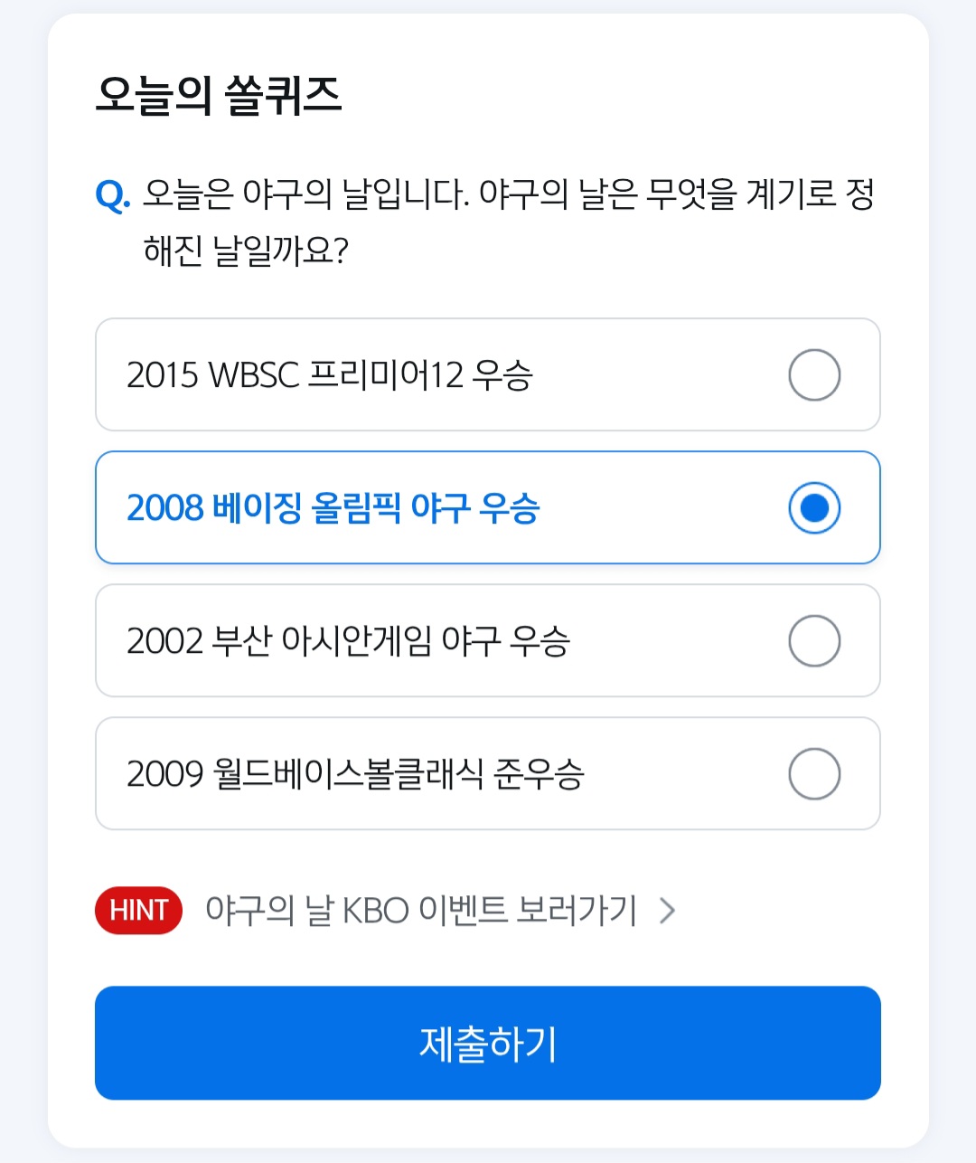 정답은 '2008 베이징 올림픽 야구 우승'입니다