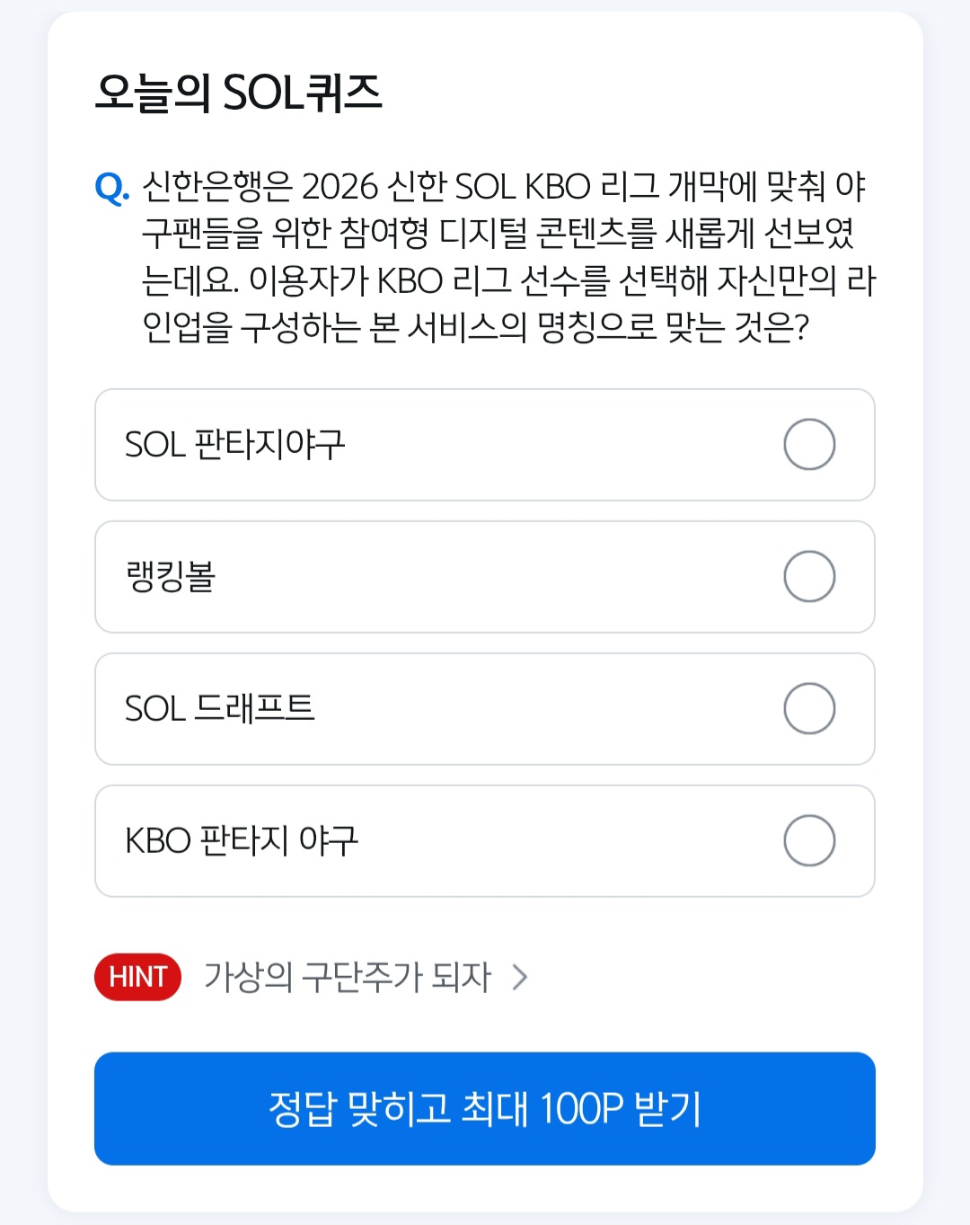 쏠퀴즈,3월,28일,2026신한SOL,KBO리그,참여형디지털콘텐츠,자신만의라인업,SOL판타지야구,랭킹볼,SOL드래프트,KBO판타지야구