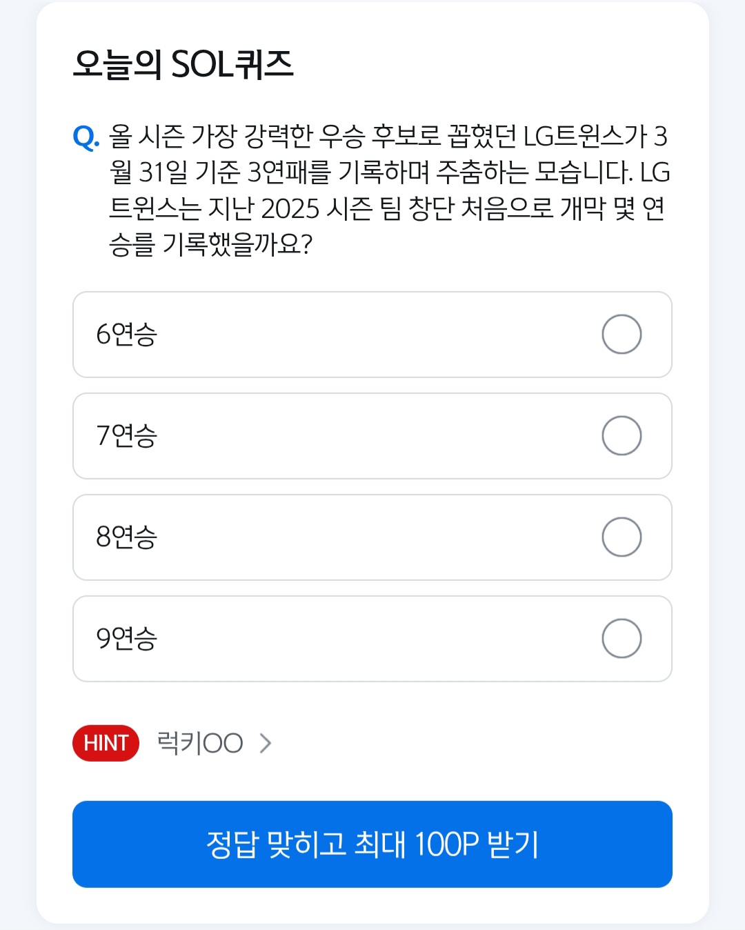 쏠퀴즈 4월 2일 LG 트윈스는 지난 2025 시즌 팀 창단 처음으로 개막 몇연승을 기록했을까요?